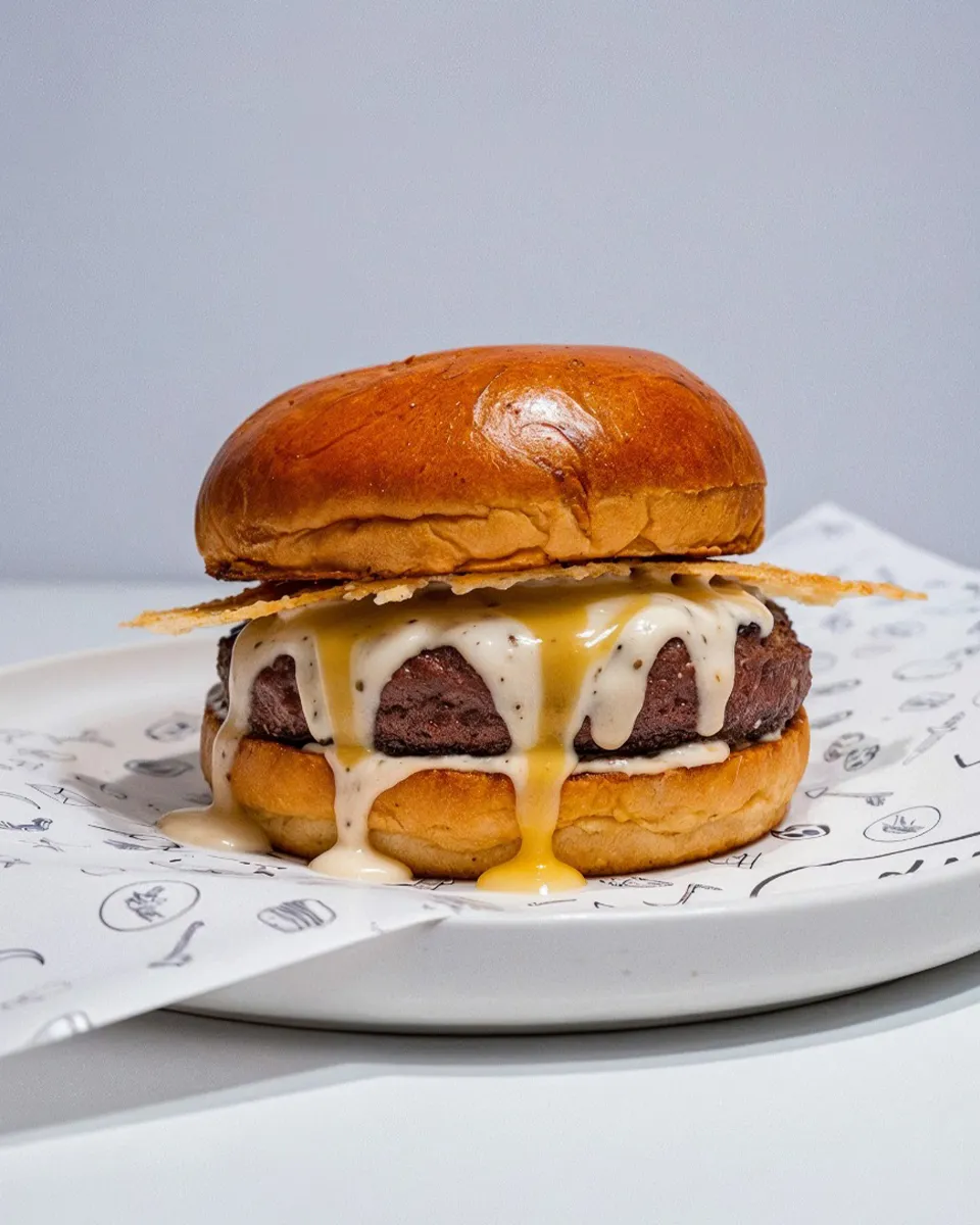 Carne madurada Dry Aged, mayonesa de foie, panceta laqueada a baja temperatura, queso cheddar ahumado, salsa cremosa de yema de huevo y teja de queso parmesano crujiente que aporta textura y un cierre perfecto